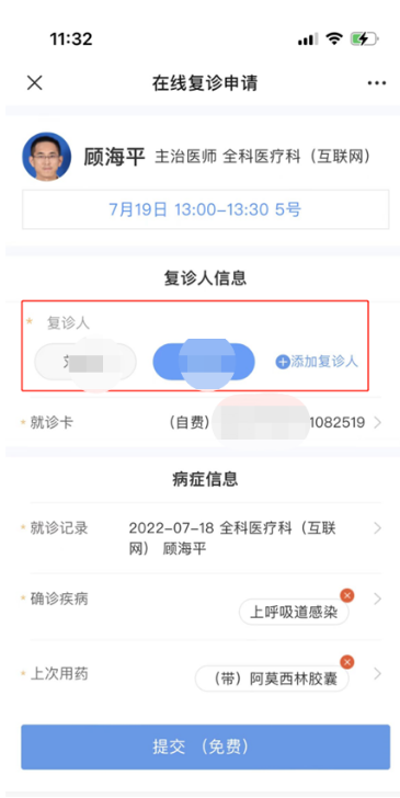 2.選擇就診時間、就診人后,輸入相關病癥信息,即可提交復診申請;