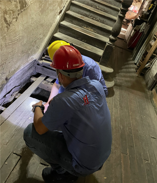 曹先生所居住的是一幢擁有百年歷史的老房子,地面和一樓鋪設的地板間有大約一米的架空空間,踩上去有明顯的搖搖欲墜感。馬師傅用工具掀開靠近墻角的地板,整個人鉆下去查看一番后,便發現了癥結所在,心中也有了維修方案。