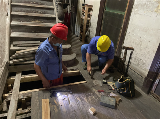 看到居民曹先生報修房屋一樓地板嚴重松動,師徒倆便立刻趕往他家中。