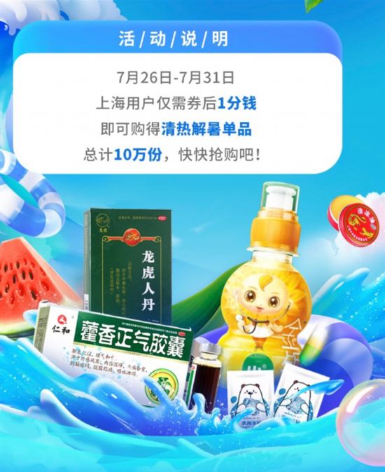 據悉,本次活動,京東藥急送聯合益豐、華氏、第一醫藥、海王星辰、叮當快藥、老百姓、泉源堂等7家藥店,為上海消費者提供10萬件清熱解暑單品。