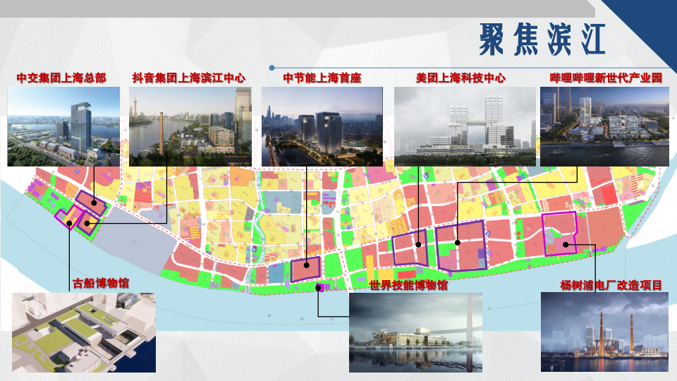 目前正在加快推進美團上??萍贾行?、嗶哩嗶哩新世代產業園、抖音集團上海濱江中心、中交集團上??偛?、中節能上海首座等一批功能性項目建設,長陽秀帶在線新經濟生態園總部秀園初具規模。世界技能博物館、古船博物館、楊樹浦電廠改造項目等,將工業遺產更新后注入文化功能的重點項目也已啟動開發建設。