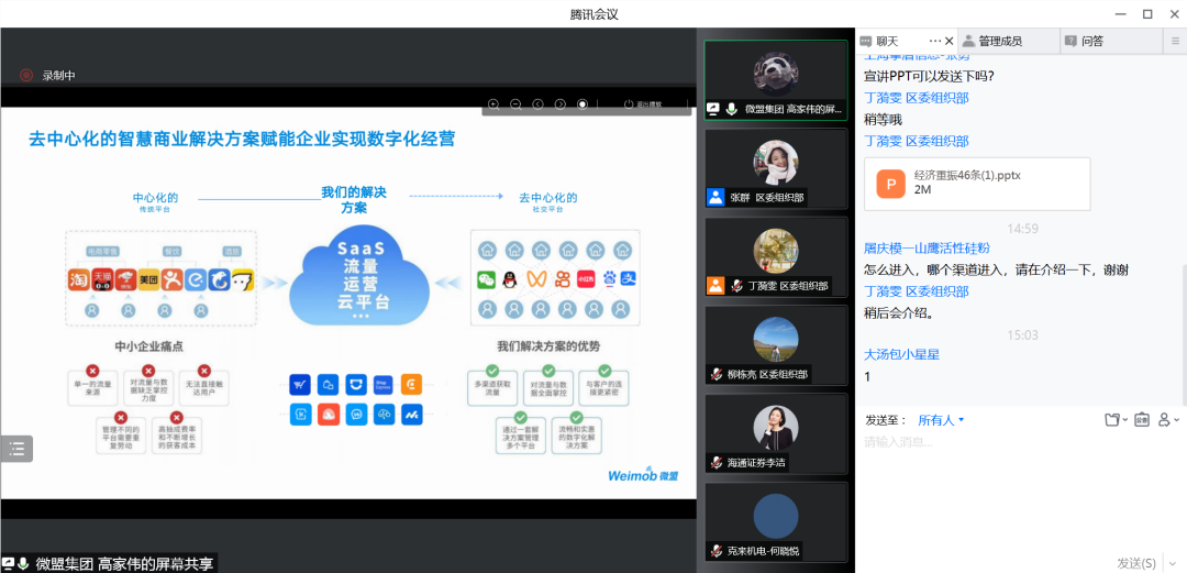 著眼提升影響力,為企業搭建新秀場。為有力促進區內企業、鏈上企業合作交流,系列活動平臺也成為了產業鏈黨建聯盟成員單位等區內重點企業展示技術產品、優勢項目、最新動態的新秀場。信息技術產業鏈黨建聯盟理事長單位微盟集團以“企業數字化轉型最佳伙伴”為題介紹微盟集團去中心化的智慧商業解決方案;圍繞如何尋找與企業需求匹配的中高端人才和技能人才,聯盟成員單位獵上網與優藍國際分享企業相關經驗與服務優勢。