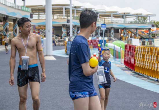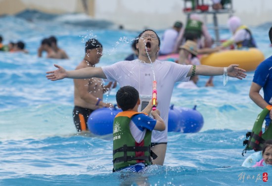 酷暑當頭,有些人躲在空調間不敢走出家門半步,有人卻在戶外玩得不亦樂乎。今天中午的瑪雅海灘水公園內,身著泳裝的大人、孩子興高采烈地奔走在水公園的各項游樂設施間,孩子們在時停時涌的噴泉區域嬉戲,追求刺激的年輕人爬上高高的“超級大喇叭”玩起狂奔俯沖,扶老攜幼的游客們則玩起了“懶人河”漂流……