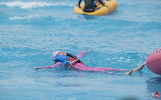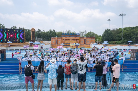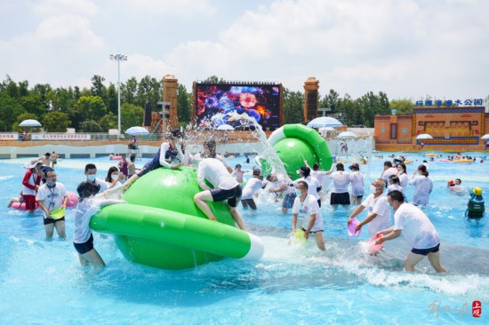 7月31日上午,百余位“上海團長”在上?,斞藕┧珗@歡樂集結,共同參與了一場“百團暢游瑪雅”水上活動。疫情封控期間,這些社區團購的主力軍在“最后100米”發揮了積極作用。今天的水上活動中,他們也奮勇爭先,在“水中拔河”游戲里分成兩組展開一場痛快水戰。