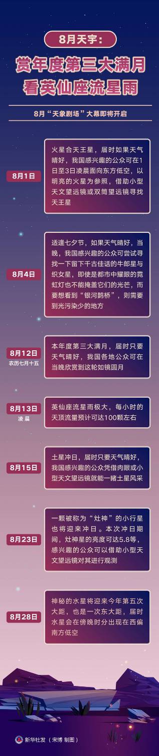 盛夏是最適合天象觀測的時節,今年8月的天象自然不可錯過。8月13日,“北半球三大流星雨”之一的英仙座流星雨將迎來極大期,為公眾帶來“夜空禮花”。此外,火星合天王星、土星沖日、灶神星沖日等天象也值得關注。