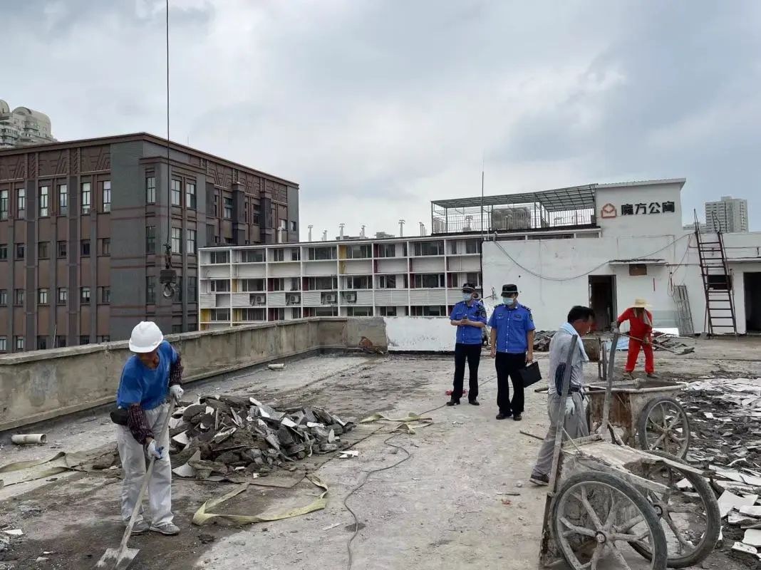7月初,在多方準備和努力下,該違建正式動工拆除。為守住安全生產底線,預防高空墜物等安全事故發生,“城管藍”們在烈日下堅守拆違現場,精準把控細節,對拆違工作全方位、全領域、無死角、無遺漏地全面監控。7月19日,樓頂的違章建筑已全部安全、順利拆除。