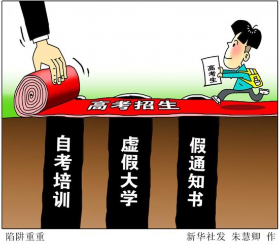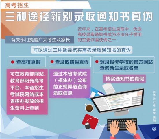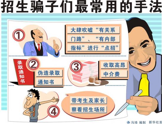 【提醒】高考成績公布后,一些不法分子自稱以“計劃外補招”“降分補錄”為幌子行騙,利用一些學校發布的征集志愿信息,誤導家長,聲稱計劃外補招就是不要分數線,花上數萬元即可搞定;甚至設立報名處和咨詢電話,假扮高校招生人員,偽造文件、印章發放錄取通知書。
