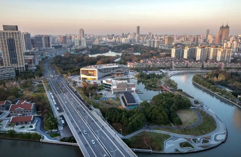 上海少年兒童圖書館(長風館)北鄰長風公園、南望蘇州河畔,從空中俯瞰,微微起拱的建筑猶如一拱虹橋,融于城市綠地之中。步入長風館室內,宛如進入了一座閱讀“森林”。館內分布著大小不同、高低起伏的圓形書架,一棵高大的“智慧樹”與中庭、螺旋樓梯聯通,一本本整齊排列的書籍向上延伸入開放式穹頂,展現枝繁葉茂的閱讀生命力。