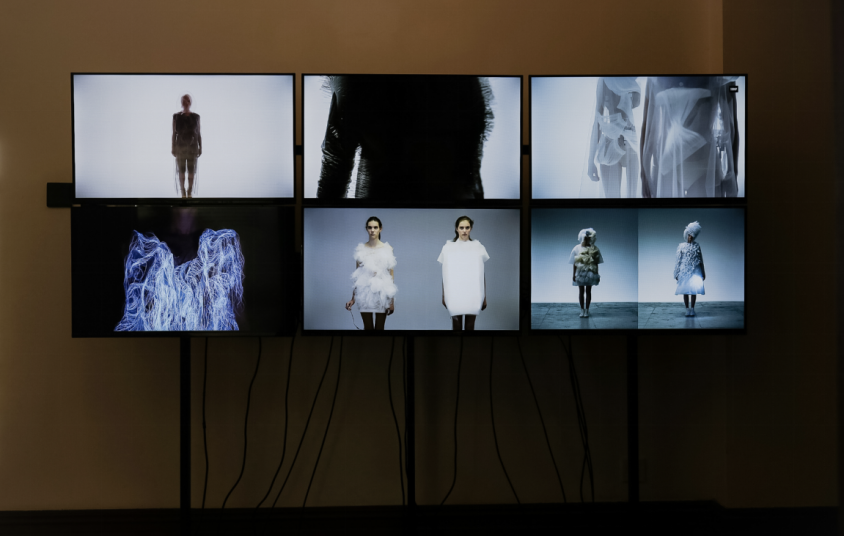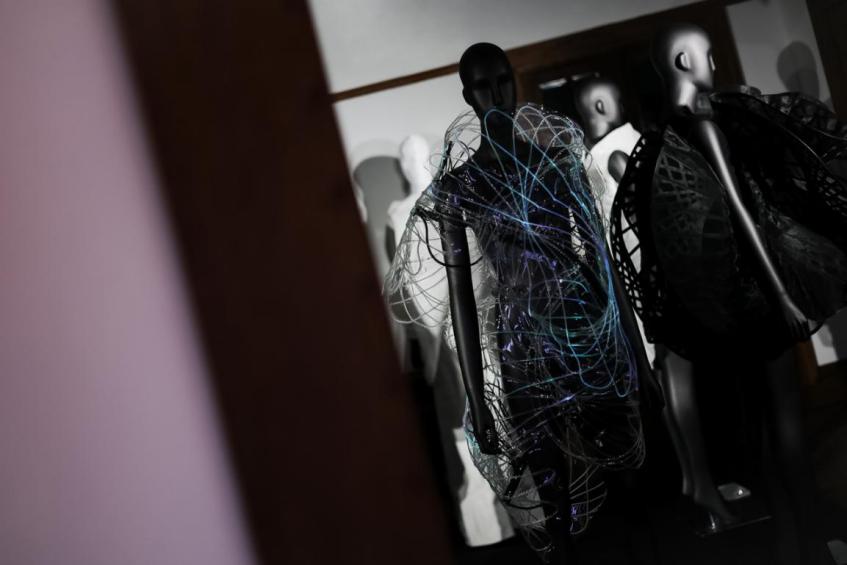 設計師threeASFOUR創建了融合尖端科技和傳統工藝的傳統,使時尚和藝術在服裝設計中交融。靈感來自于聲音天然的多層次特性,這件作品以諧振圖形為模型,由若干層透明塑料材質的單色諧波平面疊成,上面還綴上了各種模仿聲波流動曲線的光纖燈動畫圖案。