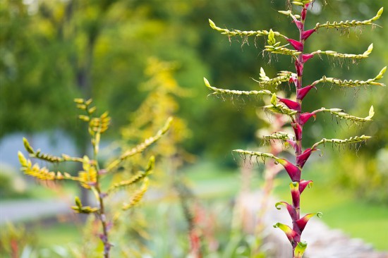 為了達到最佳景觀效果,設計師精心挑選了10個種(品種)、共計51棵鳳梨,其中包含帝王卷瓣鳳梨、香花卷瓣鳳梨、曲軸卷瓣鳳梨等大型觀葉及觀花的種(品種),正在開花的幾株卷瓣鳳梨高度達2.20米,猶如一棵棵小樹,優雅地伸展著枝條,仿佛正張開雙臂歡迎前來參觀的四方賓客,寬闊的葉叢則盡顯其高貴氣質。陪伴在高大的卷瓣鳳梨周圍的還有一些尖萼鳳梨屬的開花植物,它們也具有較為挺拔的花序,高度在1.5米左右,其中紅苞尖萼荷的葉叢形成中間大、兩頭小的寶瓶狀,十分奇特。