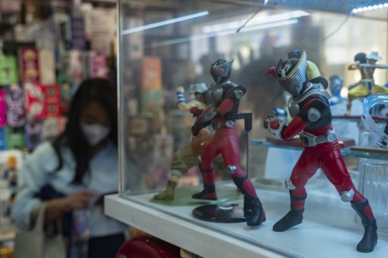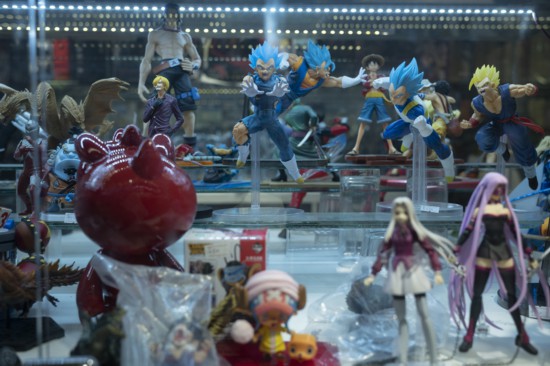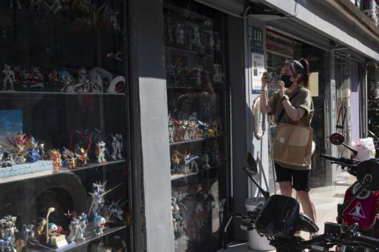 一位漫迷在拍攝櫥窗中的動漫周邊產品。