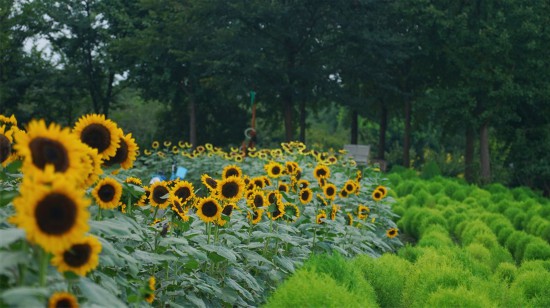 從空中俯瞰,一株株毛茸茸的地膚,排列錯落有致,重重疊疊,參差起伏,構成一幅滿目清涼的風景畫。而一株株向日葵昂首挺胸,帶著熱情奔放的活力,唱響一曲夏日歡歌。