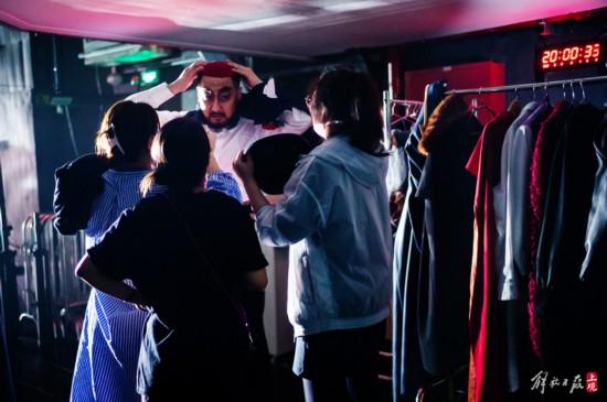 8月3日下午5點,首演前的正式彩排結束后,演員們留在后臺,繼續練習劇中的動作、表演。
