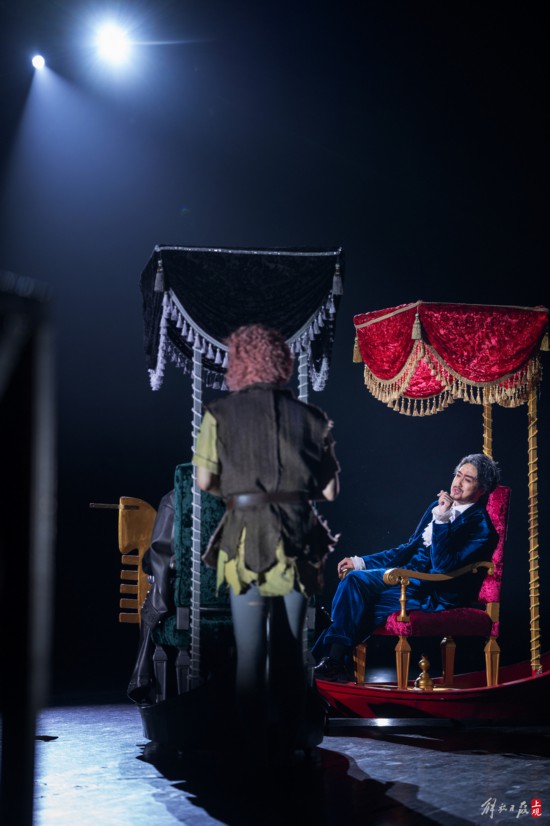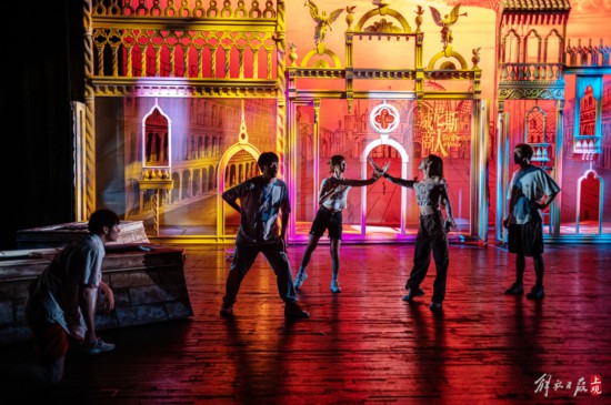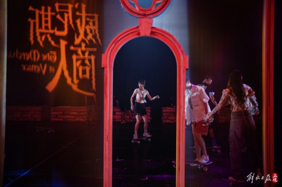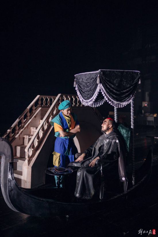 說是“首演”,這當然是一部經典作品。陳薪伊導演在其創作生涯中,也曾數次將其搬上舞臺。但是,此次導演從舞美、服裝、配樂等板塊,都對這部老戲進行了徹底的改造。其中最亮眼的,是陳導為了將威尼斯水城的流動感搬上舞臺,別出心裁地用滑板替代了“貢多拉”(威尼斯尖舟)。