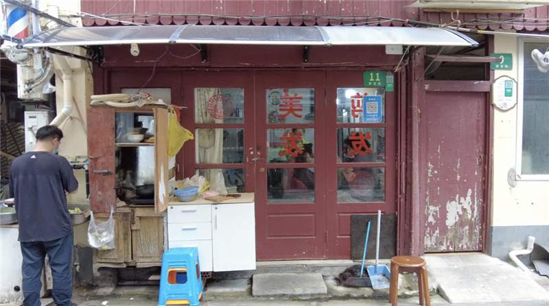 商鋪與商鋪之間,隱藏著不起眼的小門,拐進去別有洞天。狹窄的過道里,隨處可見建筑本體之外搭建的“小灶披間”和“小淋浴間”——連一個成人站進去都很逼仄,更何況還要放置廚衛設施、鍋碗瓢盆??臻g再小,家庭主婦們都能在其中忙碌四季,精心烹調一日三餐。