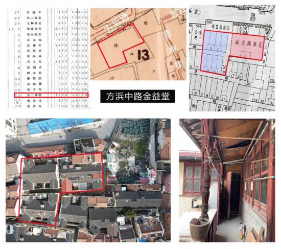方浜中路曾經是老城廂內一條東西方向的重要河道——方浜,金姓業主在此購地首建金三益堂宅(行號路圖右側紅色地塊),這是一座一正兩廂的二層三合院絞圈房,枕河而居的清代大宅,現今的門牌號碼是方浜中路614弄1號。后來,業主又在左側空地建造上下兩排聯體早期石庫門(行號路圖左側藍色地塊),現今的門牌號碼是方浜中路614弄3、4號和15、16號,這個早期石庫門里弄稱“金益里”。