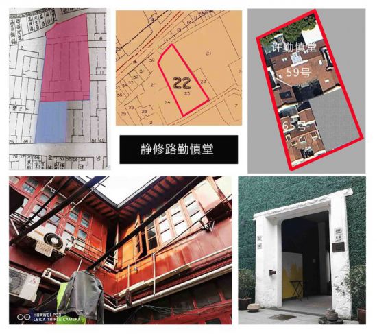 靜修路許宅位于靜修路59號,地籍冊上所登記的業主名是許勤慎堂,從“靜修路許宅地籍圖”看,業主購置了一大塊南北方向的矩形地塊,北接肇嘉浜(復興東路),南至靜修路。歷史上,復興東路曾經是一條稱為肇嘉浜的重要河道,許宅是一座位居河道南岸枕河而居的江南大宅,船行十分便利。先行建造靜修路59號,是一座一正兩廂的三合院樓房,帶有儀門,是清末建造的絞圈房,經過修繕,現今成為某公司的辦公用房,從北面的復興東路進出,所以,又增加了一個復興東路950號的門牌號碼(行號路圖紅色部分)。后來,業主在南面沿靜修路建造早期石庫門(行號路圖藍色部分),現今靜修路65號。