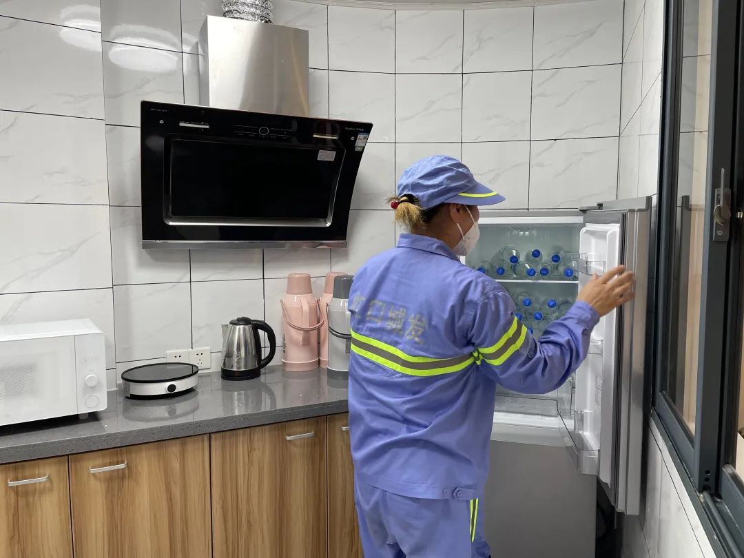 下午2點多,室外溫度超過35度。在位于三河路25號的愛心驛站,幾位環衛工人正在喝水休息。他們是城發下屬虹遠公司嘉興作業塊的環衛工人,在氣溫最高的下午時段,班組安排他們輪流在愛心驛站休息,吹空調,喝口水,享受清涼,恢復體力后再投入到保潔工作中。