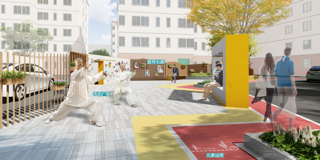 人文花園位于小區入口處,在保留原有功能的前提下,增添藝術性的地面設計及座凳設計,形成獨有的空間藝術感,為社區生活注入活力。通過花壇綠化、人文墻分離出車行道與活動空間,形成安全屏障,設置格柵宣傳長廊以降低廣場活動對周邊居民的噪音干擾。