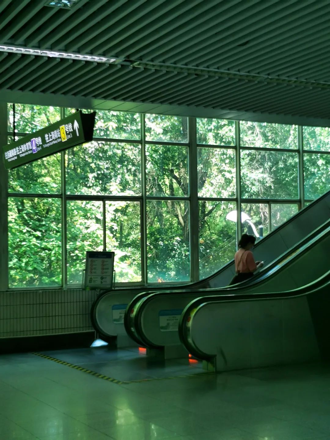 進入延安西路站站廳,可以看到兩邊的上下扶梯正好緊靠在窗邊,陽光透過茂密的枝葉一點點灑在出行乘客的身上,為這些被綠意包圍的匆忙身影增添了些許愜意之感。