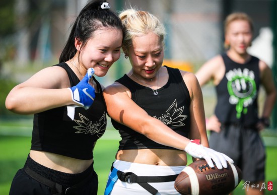 腰旗橄欖球隊隊員進行傳接球訓練。
