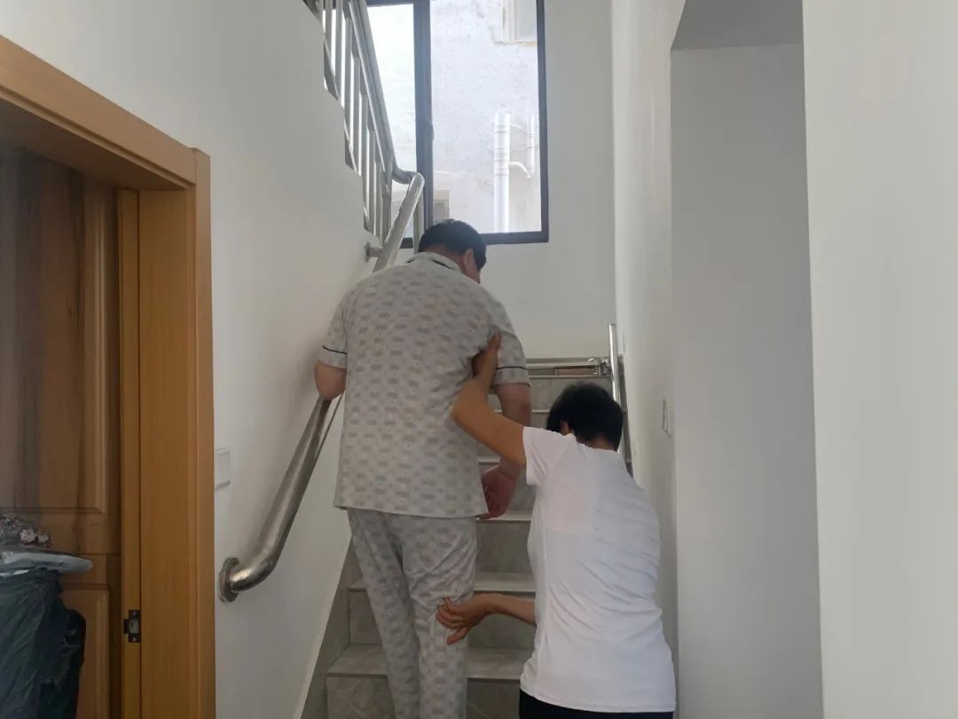 在楓涇鎮韓塢村村民鐘全云家中,施工人員正在安裝樓梯扶手。他的妻子王金寶表示,4年前,鐘全云由腦梗死引發右側偏癱,導致行動不便。多年來,他的日?;顒有枰胰藭r刻跟在身旁。今年,他們申請了殘疾人家庭無障礙改造,家里的樓梯、房間、衛生間等區域都將安裝上不銹鋼扶手。
