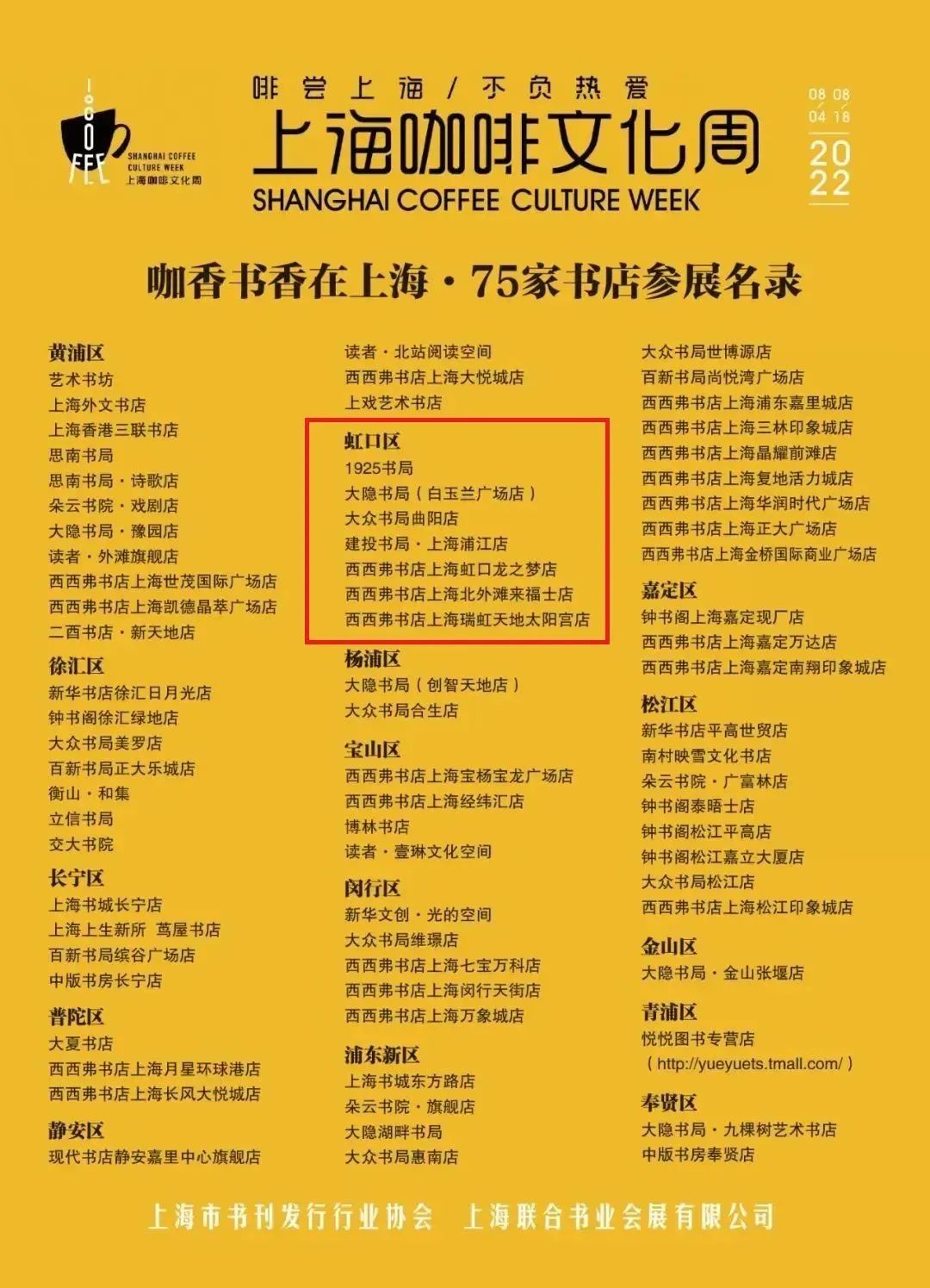 8月4日,2022上??Х任幕荛_幕。此次活動是第三屆“五五購物節”12大標桿活動IP之一,主題為“啡嘗上海、不負熱愛”。虹口區內共有7家書店參展,推出多重咖啡品嘗福利,吸引咖啡愛好者們前來光顧。這就讓小虹帶你走近其中幾家,去尋覓咖啡香氣~