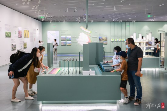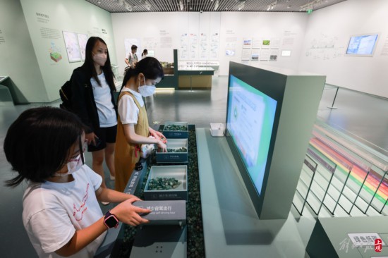 四樓“生態之城”以網絡狀為設計元素,空間呈現綠色。地上有一條藍色河流緩緩流淌,時而能看到中華鱘等生物“出沒”。在高低錯落的“地勢圖”上,只需撥動一個按鈕,紅、黃、藍、綠光隨之交錯變動,2000年前、4000年前,乃至2萬年前,長江河口的演變情況盡收眼底,演示沙盤生動地展現上海的成陸過程。
