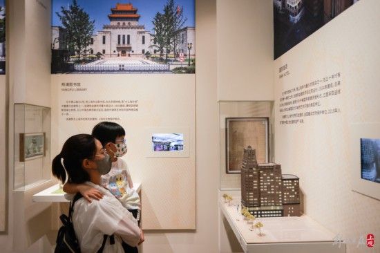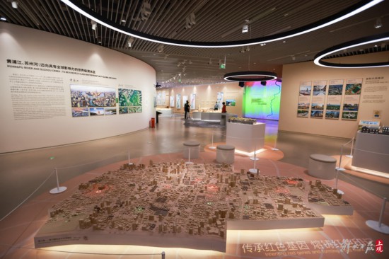 二樓“人文之城”展廳以圓為設計元素,空間以淡橙色詮釋溫度和記憶,展示紅色文化、江南文化和海派文化。春陽里、步高里、張園、曹楊新村和朱家角等微縮模型栩栩如生。
