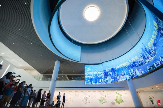進入序廳中央,視線會被懸掛上空的一組巨型8K環幕吸引,循環播放題為“上海印象”的城市畫卷。