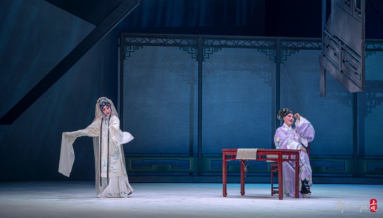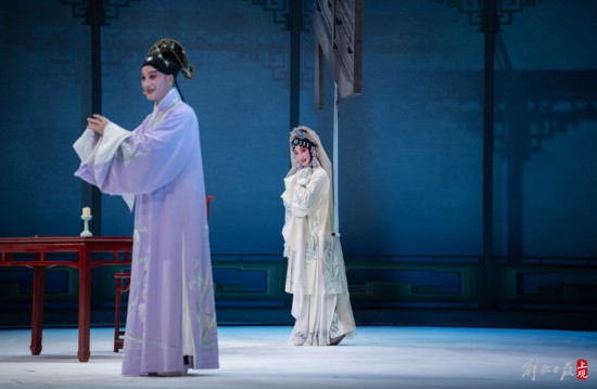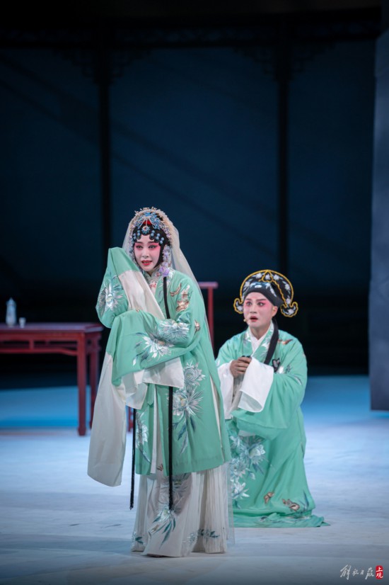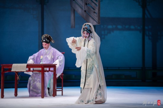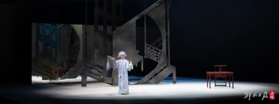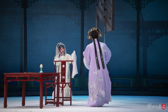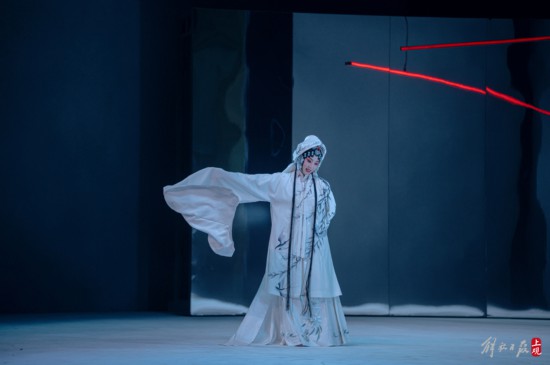 從劇照中不難看出,這是一出遵循“古法”的“新戲”。置景比傳統戲曲舞臺景致更實,意向卻比傳統戲曲舞臺更虛。鏡面、燈管、各種色調燈光的運用,使得原本大白光的戲曲舞臺上,呈現出了層次豐富的視覺效果;同時絲毫不搶人,不搶戲,妥帖地為角色營造出沉浸式的表演空間。
