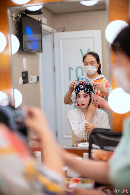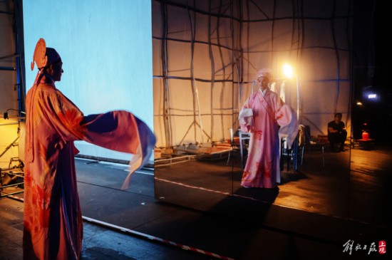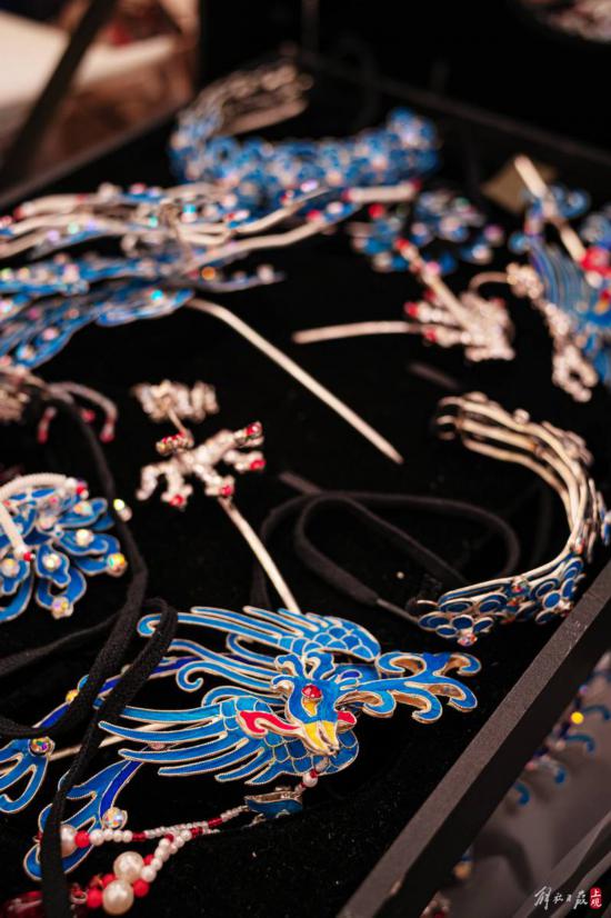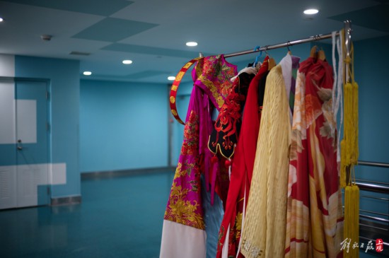 化妝桌上擺放著杜麗娘華美的頭飾,后臺過道里掛著精致的戲服,今天它們將與演員們一起登臺亮相。