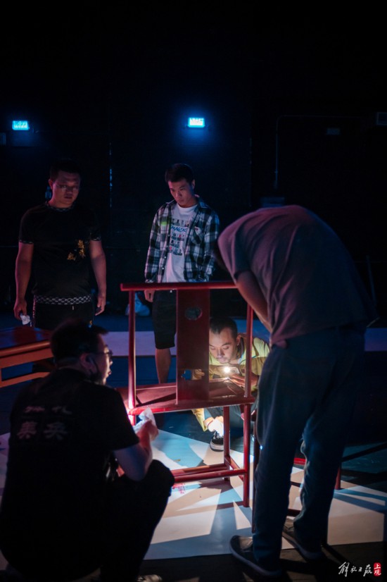 臺側,舞美師傅們仔細為道具椅子補漆。當晚即將進行這部戲的首度帶妝聯排,這也是首演前唯一一次把戲“順一遍”的機會。