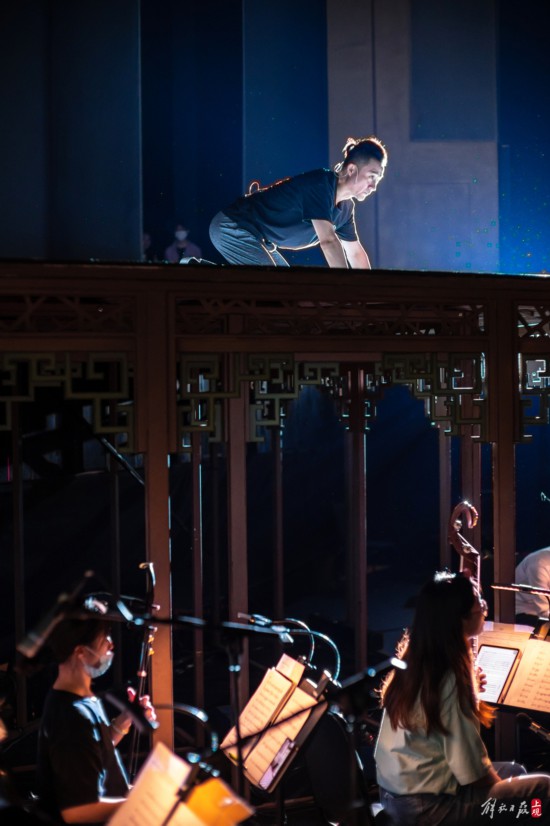 雖然是樂隊排練時間,在劇中飾演柳夢梅的張軍毫不惜力,在樂隊的伴奏中,在舞臺上用力地練功、表演。