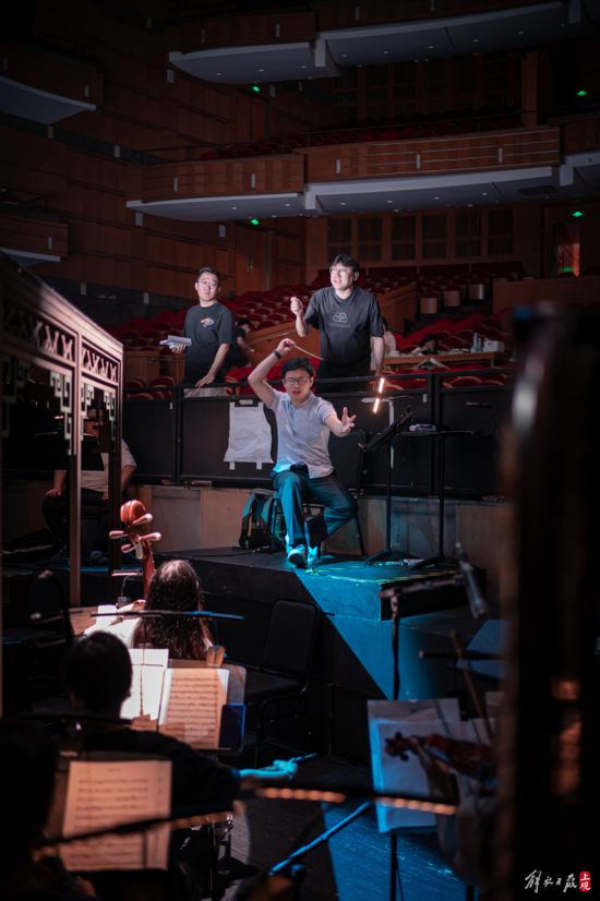8月9日下午,指揮葛維岳在樂池中帶領樂隊排練伴奏曲。導演馬俊豐站在指揮身后,和指揮一起調整著每一個樂段的處理。