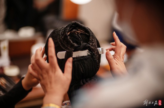 化妝是個精細的手藝活,一層層的發片、辮子,相互咬合纏繞,最后再戴上頭飾。既要松緊得宜,也要配色得當,為角色添彩。