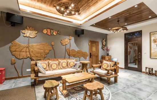 整個大廳氣氛十分廣闊,墻壁上栩栩如生的荷花都是請專人繪畫雕刻,屋頂實木梁環繞,起到了堅實的質感,再加上竹管燈的搭配,柔和的燈光彌漫,柔軟而自由。