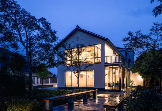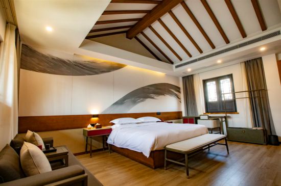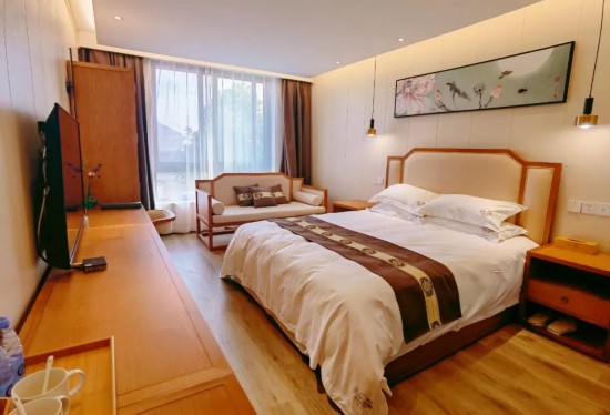 在“稻香花舍”里,處處可聞生態稻香,可享田園之樂??头吭O計皆以新中式風格呈現,也融入了現代審美的優雅大氣,房間內原有線條和新增的木質架構完美契合,呈現出復古與現代交融之感。建筑整體去繁見簡,不追求過多裝飾和熱烈的風格,整體透露著沉穩內斂的氣質,令人倍感愜意。