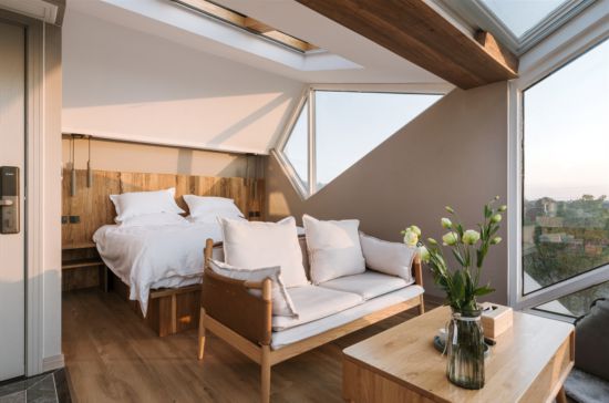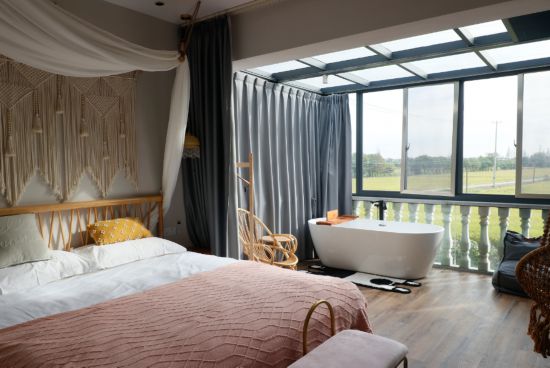 客房中,有一間星空房很特別。在這里,醒來是田園,躺下是星空,因為做了三層玻璃隔音,即使雨滴敲打窗檐,也不會有聒噪之感,反而在水滴滑落時,有朦朧的詩意美。夜宿于此,能數點點繁星,觀晚霞落日,讓人在恬靜的鄉村中看到大自然的永恒。