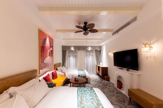 房間設計墻體大面積留白,羅馬柱般的裝飾線簡潔明快;以金屬線框和彩繪玻璃為點綴,適度的華麗增添了明亮,而木質家具則提升了屋內的整體氣質。吊扇、壁畫、窗幔......每一個細節空間都充滿著歐式韻味。