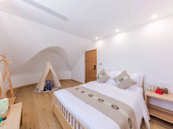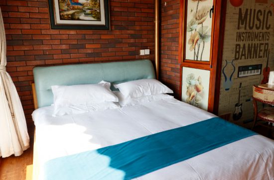 在曼妙的音樂聲中,抿一口茶或配一點紅酒,音樂入酒醉在心頭,緩緩沉入夢鄉?!爸{歌”是一家以鄉村音樂為主題的民宿,每個房間里都能看到音樂元素,床頭還特別放置了立體音響,讓動人音樂與眼前美景完美融合,帶你沉浸式體驗郊野田園之趣。