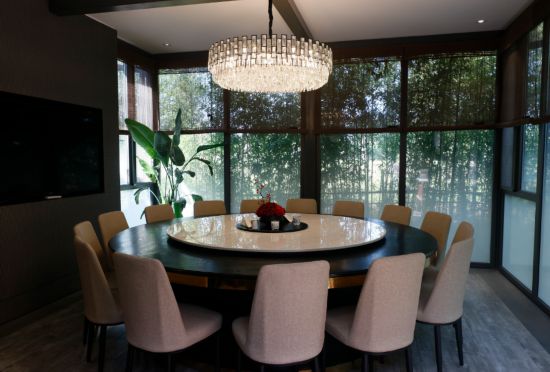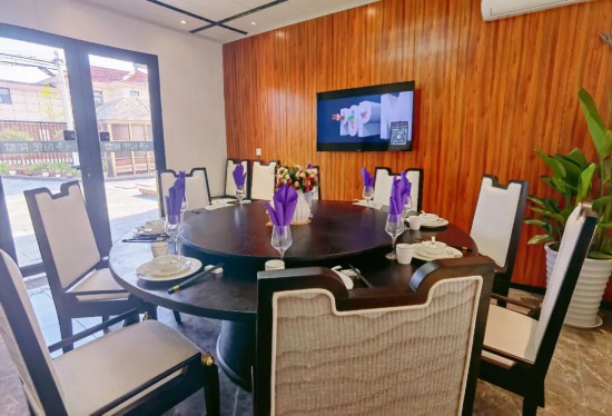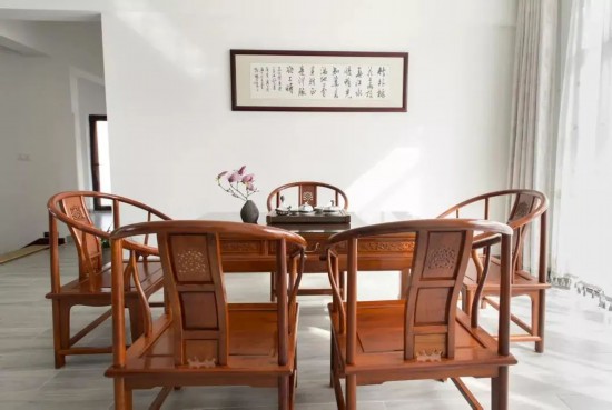 走進“臨星宿”干凈整潔的院子,赤墻紅瓦,四周以自然竹林花木與院落隔開,通透又私密。一樓客廳里是清一色的花梨木家具,能聞到淡淡木香,懸掛的筆墨,處處都透著一股文化的氣息。拉上窗幔又別有風味,立馬成了一個浪漫的K歌空間。