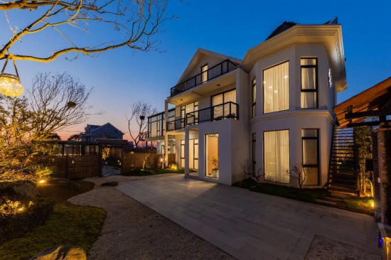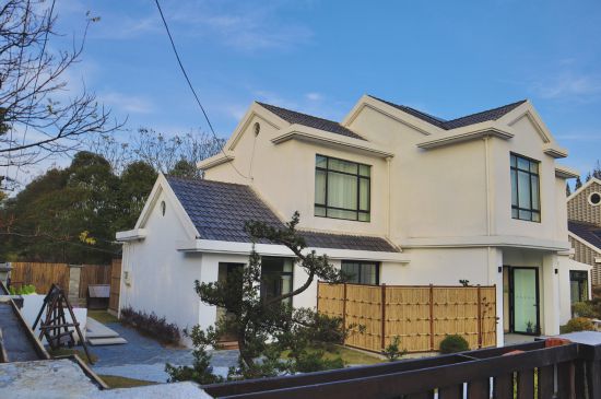民宿空間小格局大,野趣中更具雅致和散淡,原木色為主的清新風格,內部布局獨立而私密,運用幾何、線條、光影等元素,線條簡潔、潔白中有少量深色線條的日式洋樓在庭院中“玉樹臨風”……