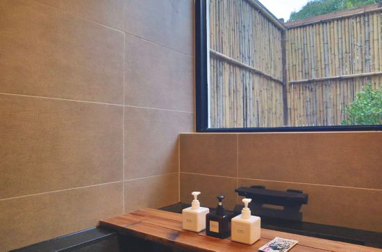 窗邊有浴缸和溫泉私湯,四周的杉林仿佛一道天然屏障,隔去世俗喧鬧。高高的竹子下是具有日本特色的水琴窟,欣賞私密小院禪景的同時,還能在熱氣氤氳中一解工作的煩憂。