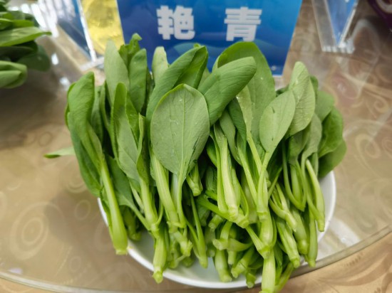 烹飪和品鑒現場,還有3個青菜品種一同亮相,引起了人們對比品評的興致?!斑@三個品種各有優勢?!笔修r科院科研人員朱紅芳介紹說,“新夏青6號”口感較嫩,也屬耐熱品種,同時其下胚軸較長,是常規品種的2倍左右,適合機械化收割,今后將是推廣機械化收割的青菜主栽品種;“新夏青7號”顏色更深,頗為好看,在種植種除了有耐熱特性,還耐濕,長勢強,這在去年臺風期間得到了檢驗,哪怕被水淹過,幾天后菜心還能頑強長出來;而“艷青”除了耐熱耐濕,還有耐抽苔的優勢,適合周年化生產……
