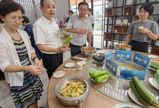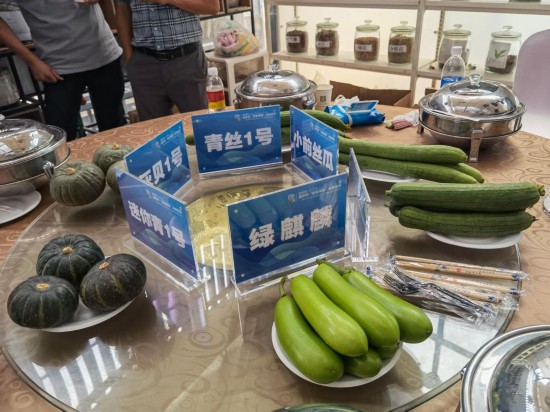 大棚里,苦瓜、綠葉菜等正長勢喜人;田頭會場里,一邊是青菜、茄子、絲瓜等新品蔬果被現場烹飪,邀請人們品鑒,另一邊則是農科人員輪番上臺“路演”,推介各自培育出的瓜果蔬菜新品種……