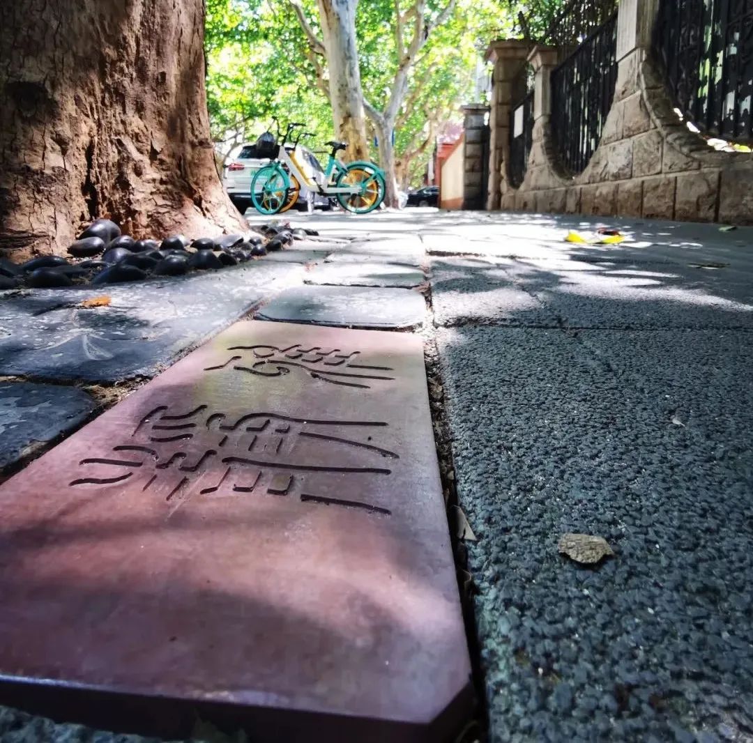 記者在愚園路上看到,道路兩側每一株梧桐樹下的樹穴蓋板均有新變化,原本青灰色的“雪花”方磚變身為印有藝術愚園、人文新華、靜雅武夷以及漫步番禺等小篆字體的紅色長磚,讓原本不起眼的樹穴蓋板變身為“形象大使”,在一磚一瓦間,展示美麗街區的藝術人文氣質。