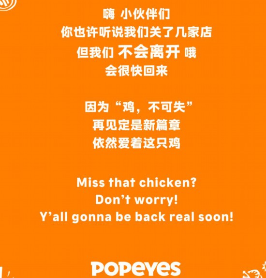 對此,Popeys在其官方微信賬號表示:“你也許聽說我們關了幾家店,但我們不會離開,會很快回來,再見定是新篇章。Y'all gonna be back real soon!”