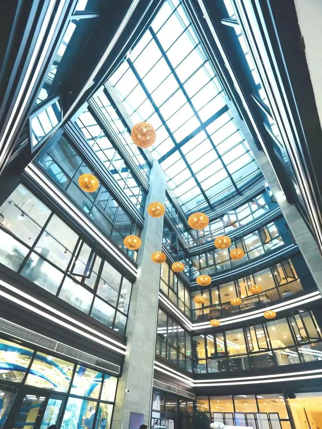 走進園區,優雅、個性、時尚的文化氣息撲面而來,園區內部空間采用挑空設計,一樓中庭直通頂層,不僅一年四季都有良好的采光,視野更加開闊、通透,而錯落有致的橙色吊燈點綴在中庭上空,令空間更加立體生動。辦公空間全部以玻璃來進行隔斷,打造了一個全透明的辦公環境,辦公空間顯得極為舒適。