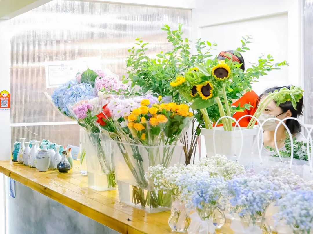 一水間是滬上知名花店連鎖品牌,繡球、向日葵、滿天星等花卉一應俱全,將市集裝點得生機勃勃,漫步休憩之后不妨買一束帶回家增添美好。